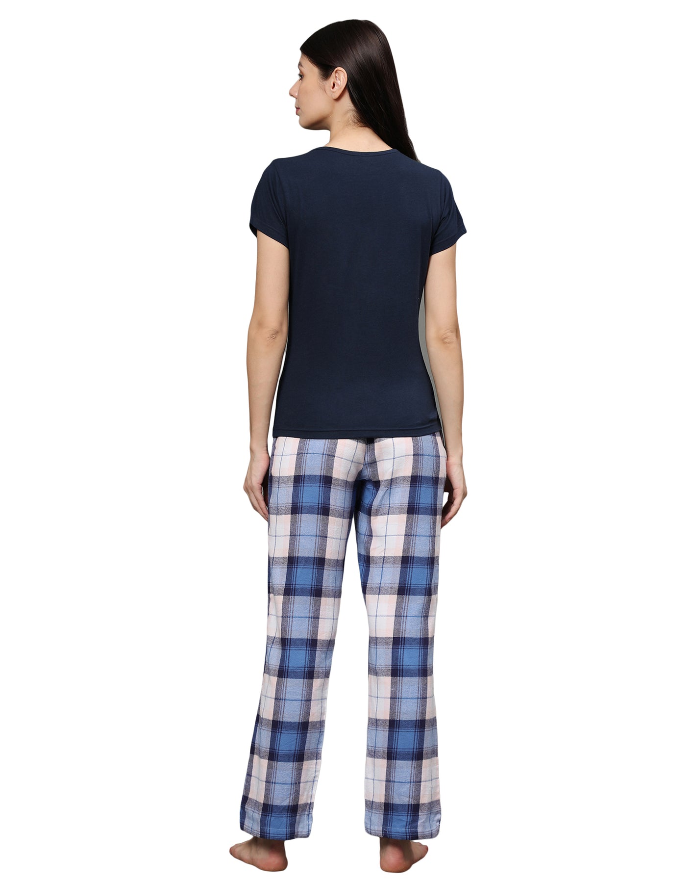 Features a classic T-shirt with trendy checked or printed pajama pants for a cozy and modern look.