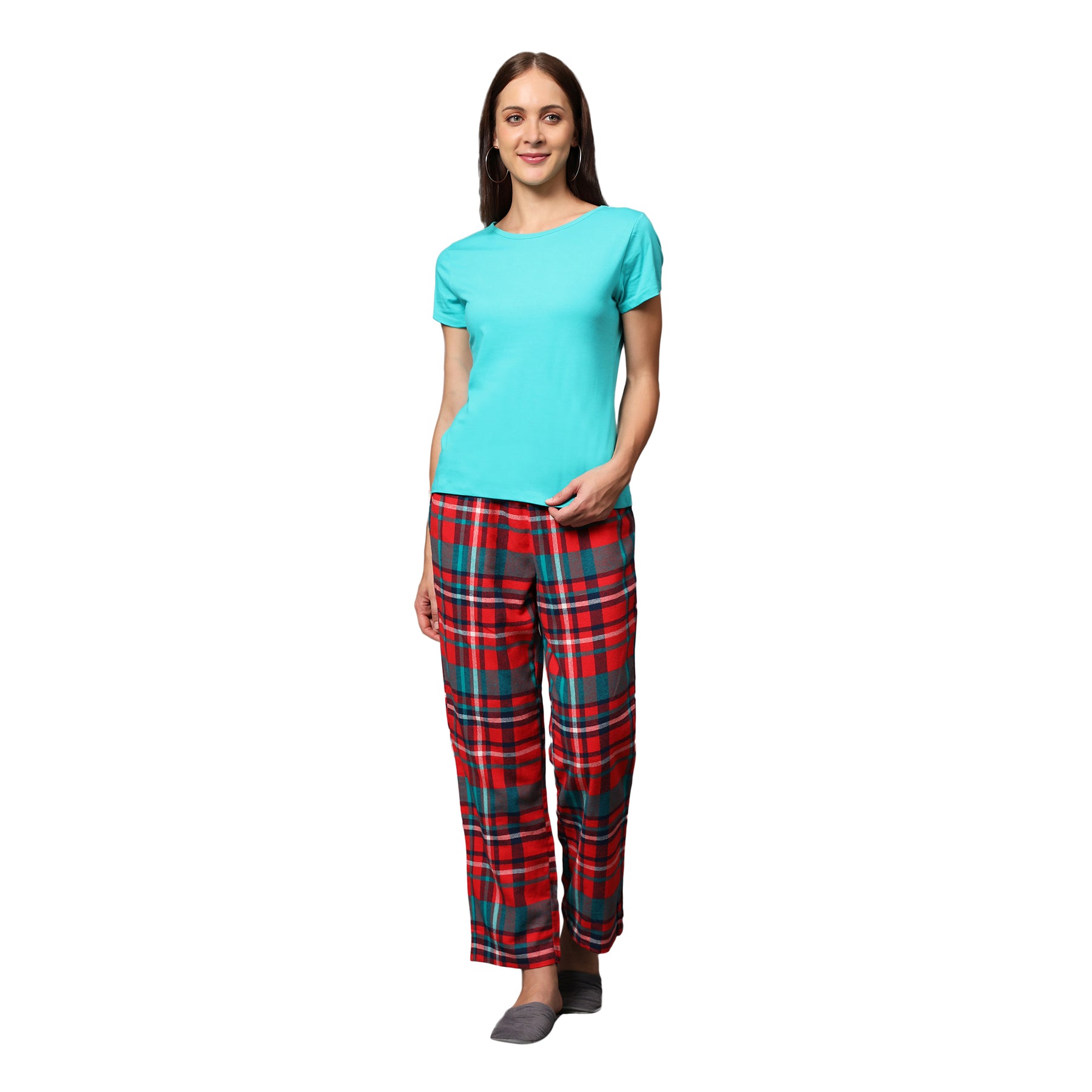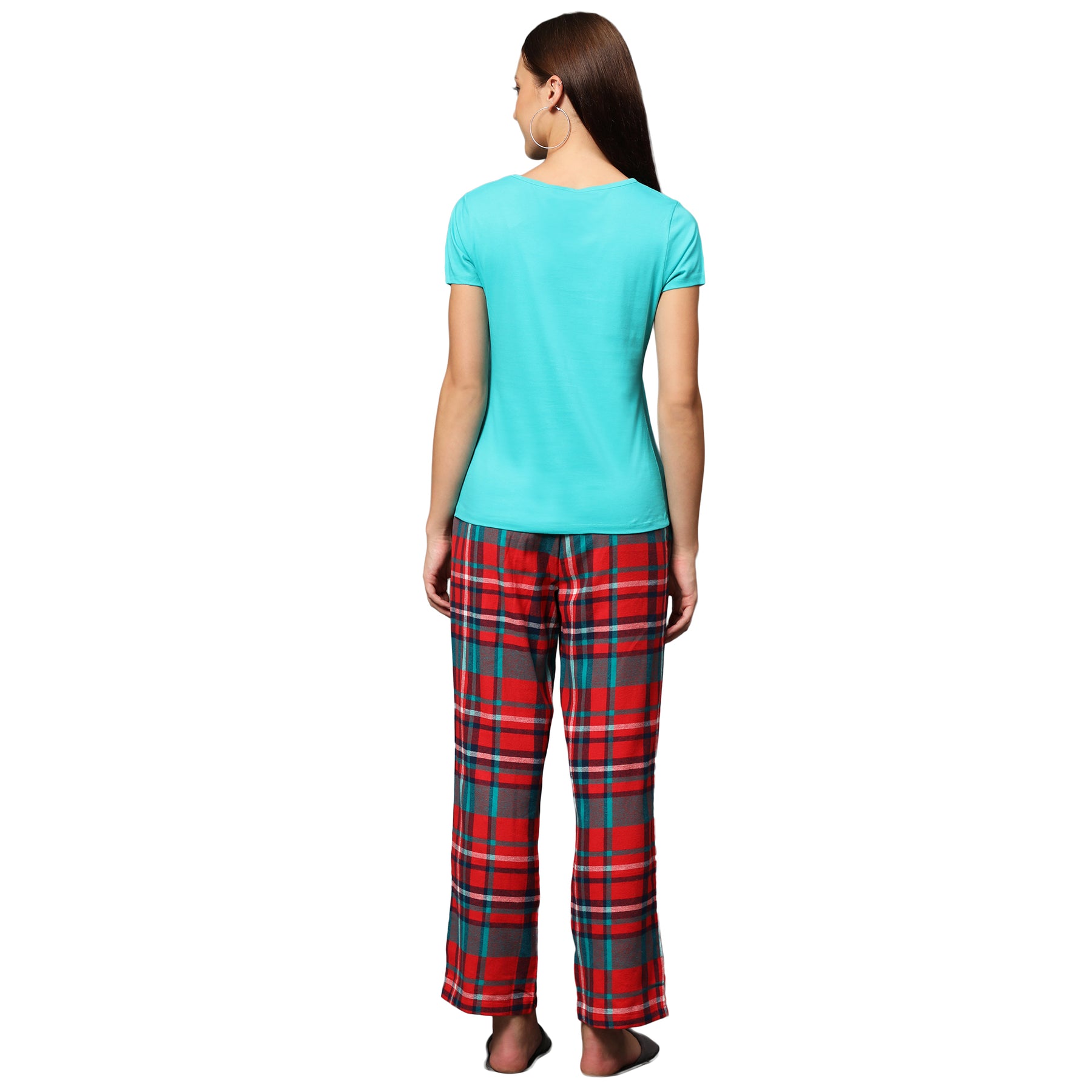 Nightwear Set - Green Solid Top & Red Checks