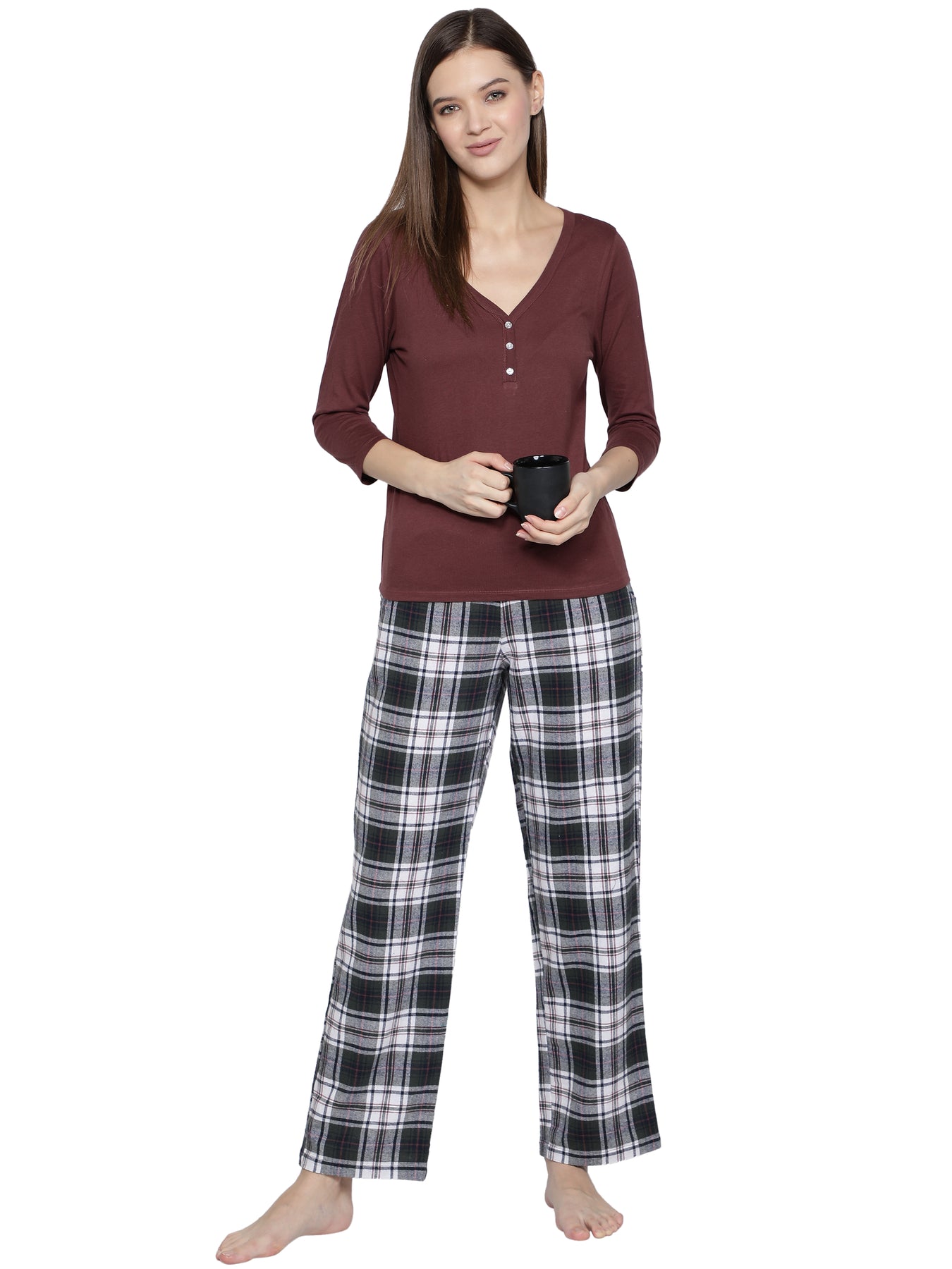 Features a classic T-shirt with trendy checked or printed pajama pants for a cozy and modern look.